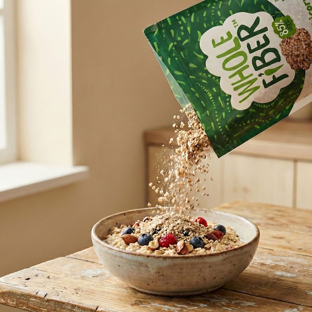 1. Eet meer vezels – Richt je op minstens 30 gram per dag uit groente, fruit, volkorenproducten, noten en peulvruchten. Met WholeFiber wordt dit doel al een stuk makkelijker: 2-3 eetlepels WholeFiber leveren 10 gram vezels, een goede aanvulling voor je vezelrijke basis.