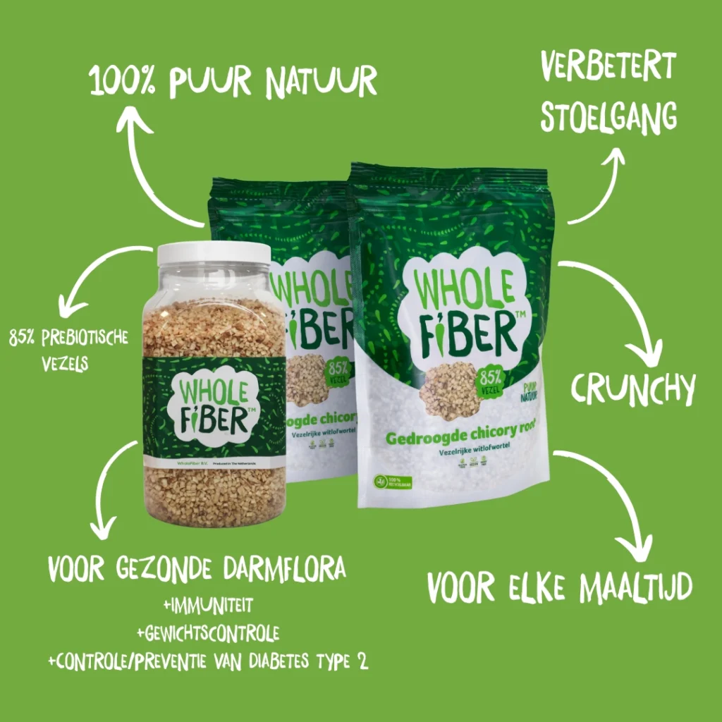 Door een paar van deze producten dagelijks toe te voegen aan je maaltijden, geef je je darmen precies wat ze nodig hebben. Met WholeFiber wordt het eten van prebiotische vezels dagelijks een stuk makkelijker. Strooi het gemakkelijk over je maaltijd of yoghurt.